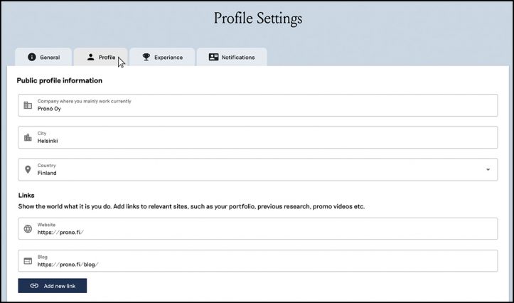 - You can add links from Prönö’s Profile settings page. (Use the left-hand side menu to navigate to your Profile settings.)