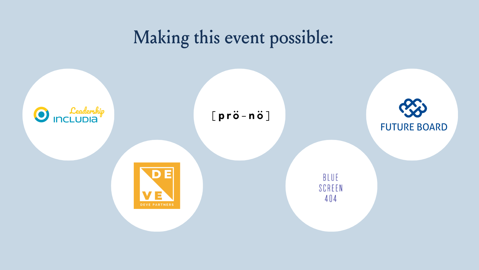 Making this event possible: Prönö Enterprises, Includia Leadership, Future Board ry, Deve Partners & Blue Screen 404.
